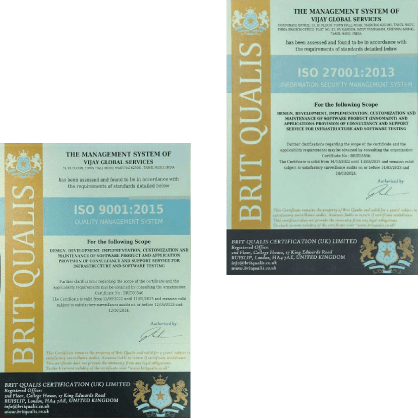 We’re gratified to receive two ISO certifications back-to-back within a short period. The certification is for the Quality Management System meeting the standards for design, development, implementation, customization, support, testing, and maintenance of software products under the banner of Vijay Global Services.